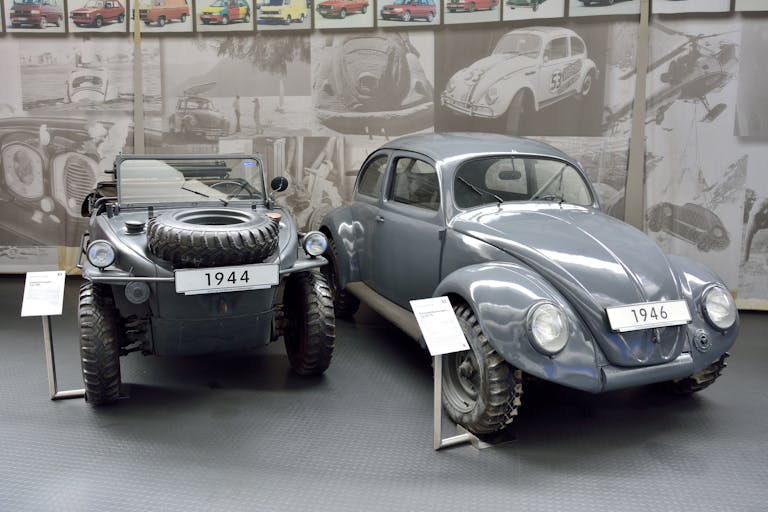Erst in der Nachkriegszeit wird das VW-Werk wieder seiner ursprünglichen Aufgabe zuteil. Die ersten nach 1945 produzierten Volkswägen, zunächst noch eine befremdliche Kombination aus vom Krieg übriggebliebenen Kübelwägen und den unter Leitung von Ferdinand Porsche angefertigten Konstruktionszeichnungen, sind mehr ein Provisorium und nicht für die Bevölkerung zugänglich. Bereits im Jahr 1946 wird aber mithilfe der britischen Besatzungsmächte die erste Serienproduktion der Typ 11-Limousine gestartet, die zum Großteil zunächst nur deutschen Behörden zur Verfügung steht.