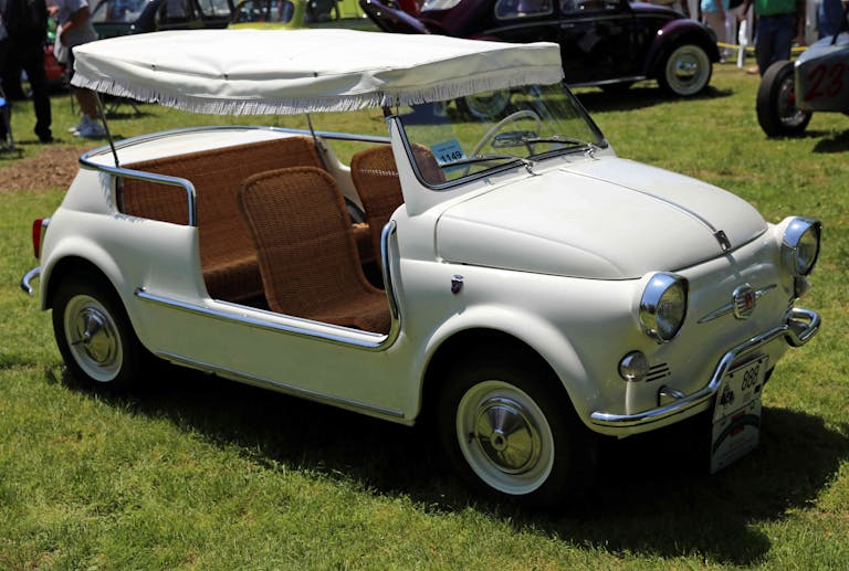 Zu dieser Zeit war gerade der Bikini in Mode gekommen. Ghias Chefdesigner Sergio Sartorelli schuf ein Strandauto, das ebenfalls nur das Nötigste bedeckte und wie der Eden Roc für die Schönen und Reichen gedacht war, die sonst schon alles hatten: Yacht, Strandvilla, nur eben kein Strandauto. Er entfernte Dach und Türen und kürzte die Frontscheibe. Da die Karosserie des kleinen Fiats selbsttragend war, musste die Stabilität nun mangels Dach auf andere Weise gewährleistet werden. Dafür wurden Verstärkungen sowohl über als auch unter dem Blech angebracht und mit Blei vergossen. An den Seiten gab es verchromte Haltestangen für die Passagiere. Dort, wo Agnelli mit seinem neuen Strandmobil gesehen werden wollte, waren Schlechtwettereinsätze eher unwahrscheinlich. Daher hielt man sich bei Ghia auch nicht lange mit einem Verdeck auf. Ein Baldachin mit einer Fransenborte an dünnen Stangen war lediglich als Sonnenschutz gedacht. Dazu passen auch die anstelle der serienmäßigen Sitze eingebauten Korbstühle. Auf ihnen konnte man auch mit nassen Badesachen auf dem Weg zum Strandcafé sitzen. Antriebstechnisch gesehen unterschied sich das neue Modell nicht von der Basisversion des 500ers. Im Heck werkelt bei beiden der gleiche 15 PS starke, luftgekühlte 479-Kubkzentimeter-Zweizylindermotor. Auch das Fahrwerk blieb serienmäßig. Das neue Strandmobil wurde unter dem Namen „Jolly“ im November 1957 auf dem Turiner Autosalon vorgestellt und erregte sofort die Aufmerksamkeit betuchter Kaufinteressenten, sodass Fiat 1958 zunächst eine Kleinserie auflegte. Später erhielt es den liebevollen Spitznamen „Spiaggina“ (Liegestuhl), denn man konnte damit an den Strand fahren und zum Sonnen direkt im Korbstuhl sitzen bleiben. Aufgrund des geringen Leergewichts von nur 520 kg ist Sand als Terrain auch kein Problem für den Jolly. Außerdem finden sich bei so einem Hingucker notfalls immer Helfer zum Schieben.