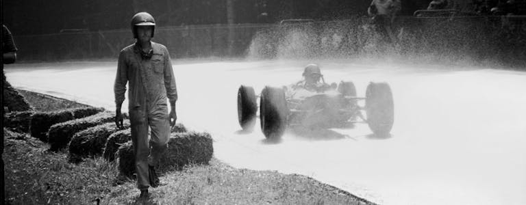 Der regennasse Asphalt glänzt im Sonnenlicht, als der Startschuss ertönt. Dicht aneinandergedrängt nehmen die Rennwagen Geschwindigkeit auf. Voran der hochkonzentrierte Jimmy Clark in seinem Lotus Nr. 6. Die Reifen wirbeln so viel Wasser auf, dass die restlichen Formel-1-Wägen im Dunst kaum noch zu erkennen sind. Ein spektakuläres Rennen beginnt, dessen Sieger den Weltmeistertitel erlangen wird.